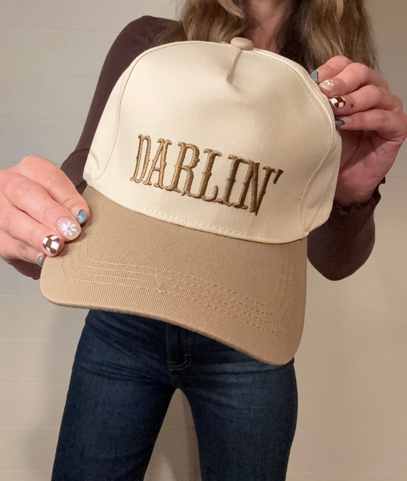 Add a splash of charm to your outfit with the Darlin' Hat. This playful two-tone mocha cap features delicate embroidery that adds a sweet, stylish touch.